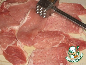 Разрезать мясо на тонкие кусочки и слегка отбить молоточком.