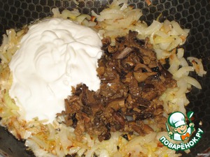 Лук порезать и обжарить на растительном масле 3-4 минутки до мягкости, затем добавить порезанные грибы, сметану, соль, перец (разные), специи по желанию и немного потушить, 4-6 минут. Остудить.