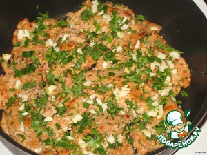 В форму для запекания на дно выложить мясо, мясо присыпать порубленной свежей зеленью и чесноком.