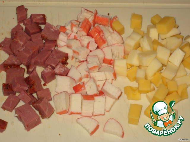 Ветчину, крабовые палочки и сыр нарезать кубиками, перемешать.