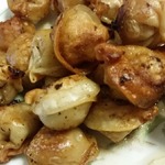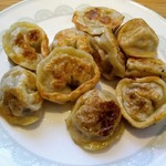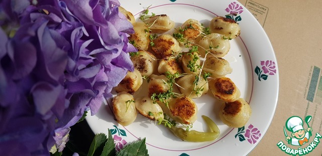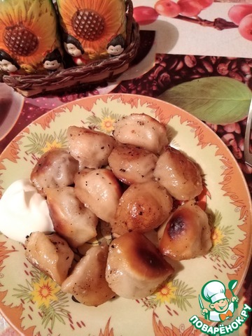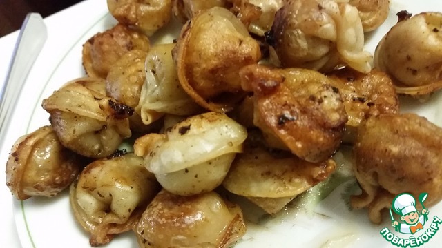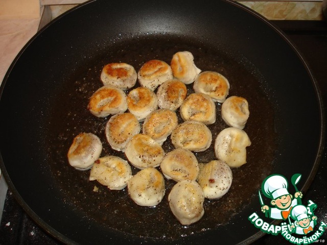 Когда пельмешки поджарятся до румяности с одной стороны, перевернуть их и посолить/поперчить с обратной стороны.