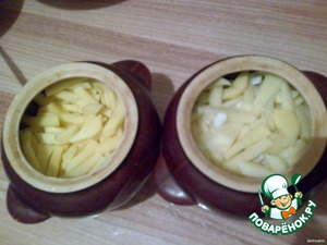 • В горшочек уложить слой капусты, затем слой картофеля.
