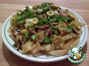 Выложить рагу на тарелку, посыпать зеленым луком и нарезанными маслинами.