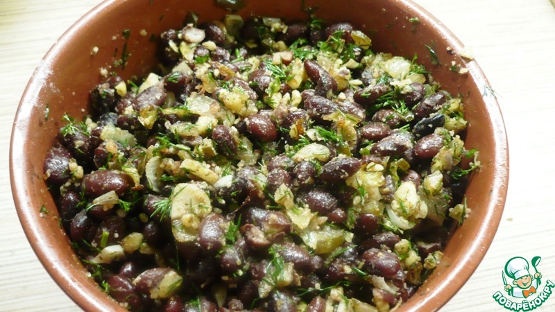 Фасоль замочить на несколько часов. Недавно узнала, что в воду для замачивания надо добавить соды (это чтобы фасоль была мягче), потом промыть ее и отварить. Порезать тоненько соленые (не маринованные, а соленые) огурцы, мелко-мелко лук. Обжарить вместе лук и огурцы на растительном масле, минут 10-15. Посолить, добавить перца черного и красного, выдавить чеснок.
