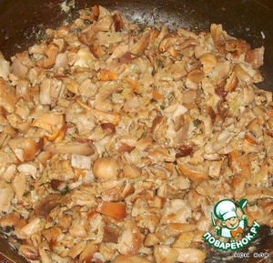 Отвариваем грибы примерно 1 килограмм, откидываем, чтобы вода стекла. Мелко нарезаем и обжариваем. Репчатый лук около 500 грамм мелко шинкуем и обжариваем. Чтобы лук имел красивый цвет, добавьте немножко сахарного песка при обжарке. Смешиваем обжаренные ингредиенты, солим, фарш готов.