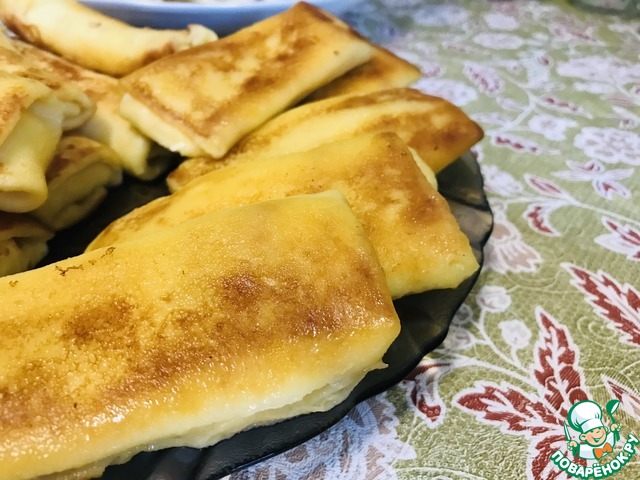 Блин кладут зажаренной стороной вверх. На блин укладывают начинку и заворачивают в виде конверта. Готовые конвертики обжаривают с двух сторон. Приятного аппетита!