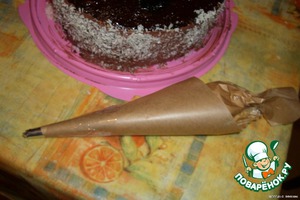 Поскольку крем мой эспериментальный растекался, я верхушку торта украсила масляным кремом (100 г масла + 2 ст.л. сгущенки - взбить) и вот таким "одноразовым" кулинарным мешочком с насадкой я воспользовалась -
