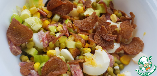 Добавляем к ним банку кукурузы, горошка и сухарики.