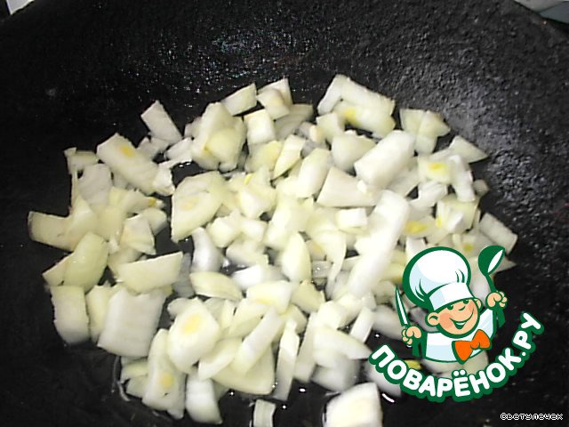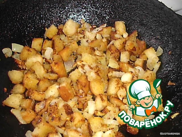 Соединить хлеб и лук и жарить до тех пор, пока лук не примет бронзового оттенка.