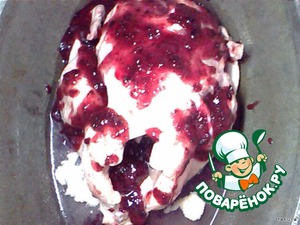 • Обмазываем курицу смородиновым джемом м выкладываем в гусятницу.