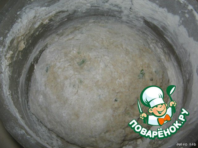 И пшеничную. Вымесить тесто немного на столе, подсыпая муки. Оно должно отставать от рук, но оставаться мягким.
