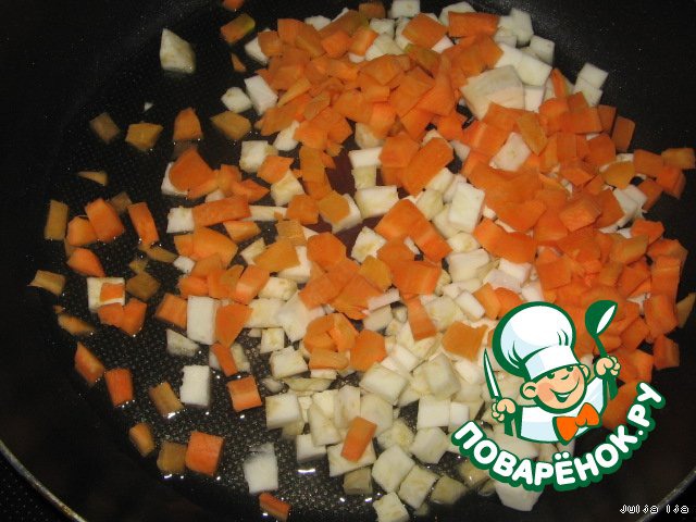 Сельдерей и морковь нарезать кубиками, обжарить на растительном масле.