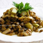 Теперь займёмся чечевицей и овощами. Чечевицу хорошо промыть и поставить вариться в достаточном количестве воды. Отварить её до полной готовности, посолить по вкусу. Если Вы не уверены, что чечевица быстро сварится (у меня 50 минут варилась), то лучше её замочить, минимум на 2 часа в холодной воде.
