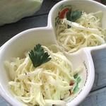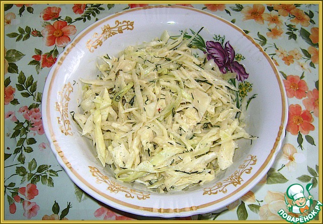 Капусту шинкуем достаточно тонко. Безусловно, красивее длинные капустинки, но я использовала капусту, оставшуюся от другого блюда.