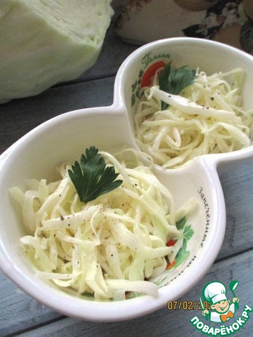 В миске смешиваем капусту, лук без стекшего сока, все перчим по вкусу. -