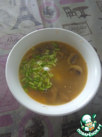 Этот супс замороженными шампиньонами,сверху приправила сухой зеленью сельдерея
