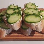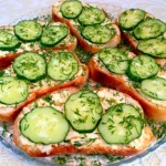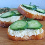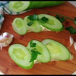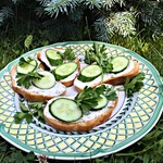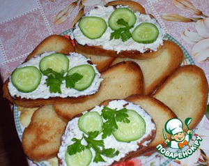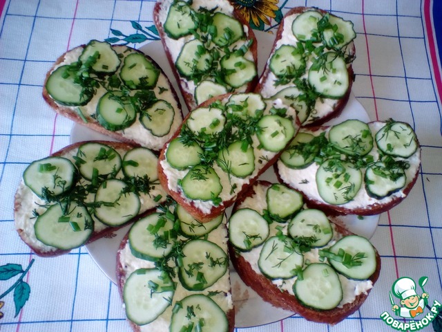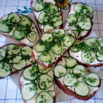 Намазываем с обжаренной стороны батон, сверху кладем по 3 кусочка огурца и посыпаем зеленью.