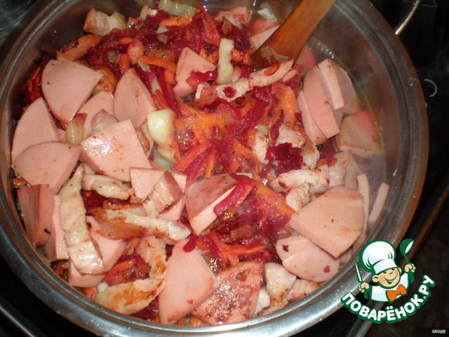 • Натереть отваренную свеклу, добавить к остальным овощам, обжарить