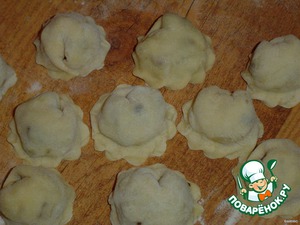 На середину каждого кружка положите по чайной ложке фарша, края плотно соедините и защипните.