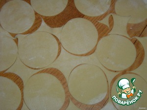 Тесто раскатайте в тонкий пласт, с помощью выемки вырежьте кружки диаметром 6 см.