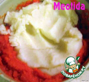 морковь блендером превращаем в пюре и смешиваем с 1/3 картофельного пюре, приправляем солью и перчиком