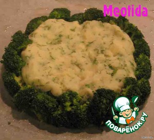 теперь по кругу выкладываем брокколли, слегка утапливая соцветия в картошку