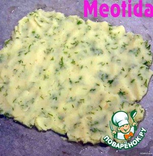 оставшийся картофель смешиваем с измельченной вежей зеленью (у меня кинза, укроп и базилик), добавляем соль и перец по вкусу