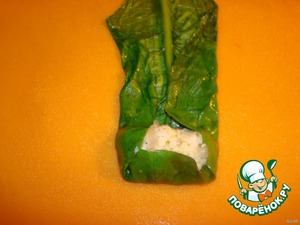 На край листа кладем столовую ложку начинки и заворачиваем как голубцы.