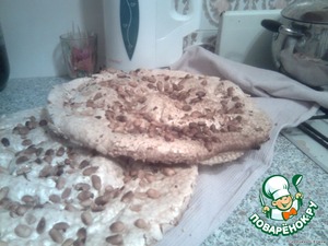 На вафельные коржи 2 шт. выложить взбитые белки, посыпать орехами и запечь в духовке. Я пекла при 180*C 45 мин.