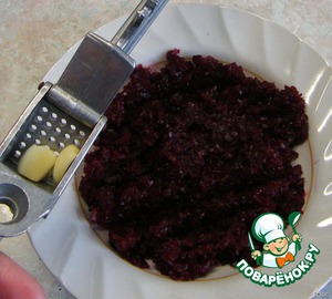 Свеклу измельчаем блендером.Добавляем измельченный чеснок,солим.Добавляем масло,перемешиваем.