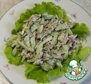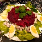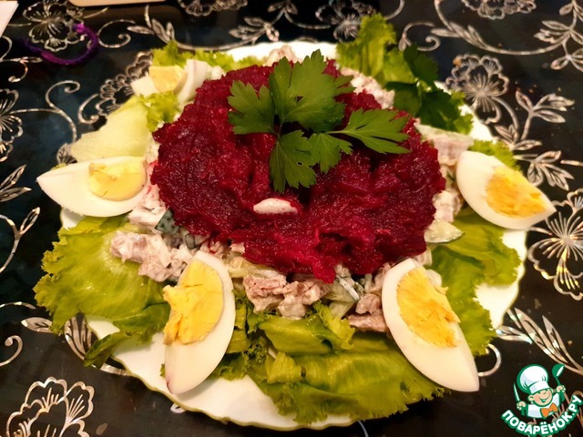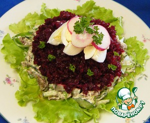 На тарелку выкладываем листья салата.Затем огурец+ говядина+ лук с майонезом.Следующий слой-свекла с чесноком,заправленная маслом.Яйца режем дольками,редис кружочками.Украшаем зеленью лука и петрушки