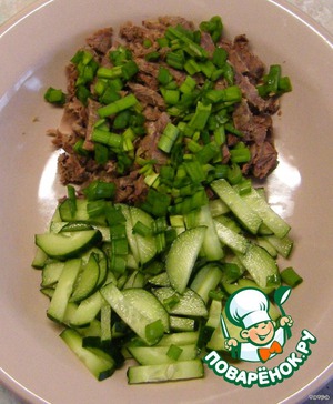 Огурец и отварную говядину порезать соломкой,посолить,добавить лук.