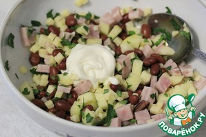 Добавить к ней ветчину, нарезанную на кубики, и мелко нарезанную петрушку.