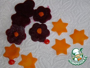 • Для изготовлния цветочков нам понадобятся вареная свекла и вареная морковь. Нарезаем их кольцами, а из колец вырезаем цветочки.