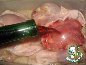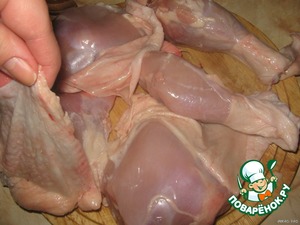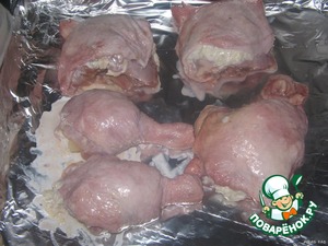 Окорочка (у меня были крупные) разрезать на две части. Посолить, поперчить - по вкусу. Снять кожу, но не до конца, так чтобы потом можно было её легко надеть назад.