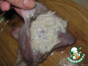 Курочка замариновалась (у меня пару часов), в каждый кусочек под кожу кладём нашу смесь.