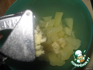 Добавляем тёртый сыр, второй зубчик чеснока (выдавливаем, натираем), оставшиеся ананасы (нарезанные мелко), а также натуральный йогурт.