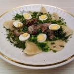 Мяско сварилось... быстренько его разделываем... и бросаем в бульон, туда же отправляем жареный лучок... закидываем в этот супчик наши вареники, как всплыли - все готово!!!