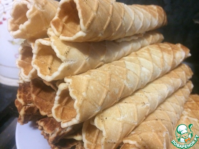 А первые трубочки, которые получились мягкими, я заново по очереди закидывала в вафельницу, закрывала её и подсушивала эти "блинчики" минуты 2 на маааленьком огне - и они тоже стали хрустящими.