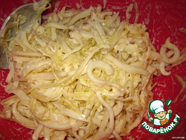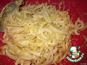 В это время шинкуем капустку и мнем еe (чтоб сок выступил)
