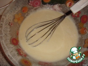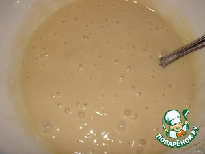Готовим тесто: 2 яйца взбиваем с 1 стак. сахара, 1 пакетиком ванилина, содой, гашенной уксусом, добавить 1 ст. сметаны 20%.