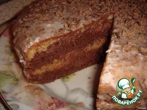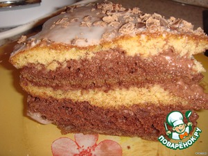 Складываем поочерёдно белые и темные коржи и смазываем кремом.