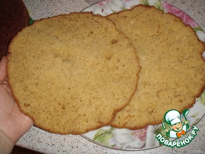 Делим готовые коржи на 2 части (и белый, и чёрный).