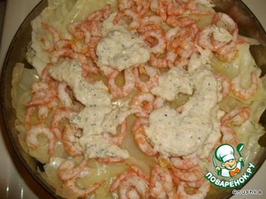 Снова слой капустных листьев. На него креветки и снова соус. |