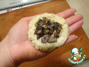 Ну, а теперь формируем котлеты. На лепешечку из фарша кладем ложечку начинки, лепим, защипываем, обваливаем в муке или панировочных сухариках.