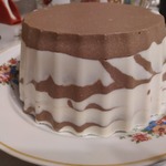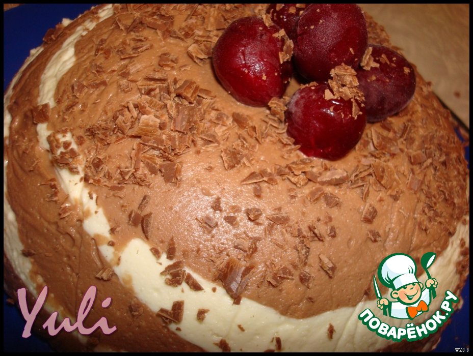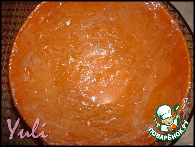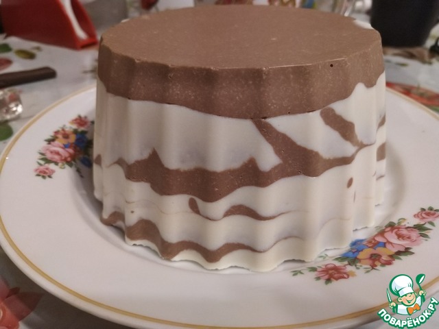 Полусферическую форму выстелить пищевой пленкой. Залить массу в форму по принципу "зебры". Охладить не менее часа.