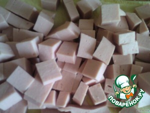 Режем колбасу и выкладываем в форму