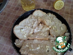 Нарезаем хлеб, так что бы на форме не было пробелов, посыпаем чесноком