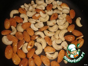 Орехи обжарить на сухой сковороде. Я брала кешью и миндаль пополам.