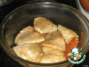 • Сначала делаем заправку-соус для рыбы - лук порезать, морковь натереть и обжарить на растительном масле до готовности. Отдельно томатную пасту развести в теплой воде, посолить-поперчить по вкусу, добавить яблочный уксус и всю эту массу влить в морковь с луком. Потушить еще с минуту и выложить на отдельную тарелку